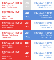 The next two matches were shared between the two sides. Simpson and Foster overcoming the EU pairing of Finnighan and Baltzis, running out 2&1 victors. Whilst in the other match Ekmark and Veinonen ground down the gallant ROW veterans Waterhouse and Dodd to claim a 2&1 win.