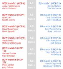 The first match up of the day was always going to be a tight affair and it was exactly that. The EU Captain Alex Hillblom sent himself off first with Henrik Fagerlund in a top class pairing. Team ROW however had their own superhero’s in Gernot Schmid and Andy Featherstone. A half point each was always going to be a fair outcome for both sides.